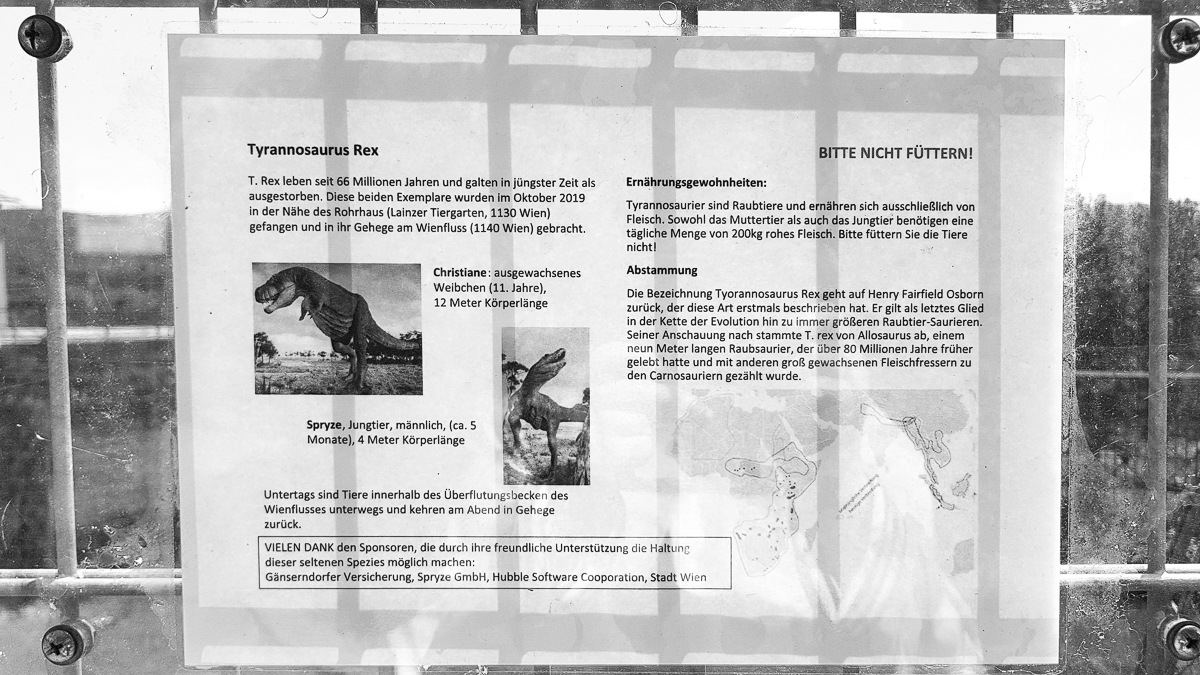 Ein extra gestaltetes Infoblatt, liebevoll ans Zaungitter getackert, verkündet - Hier wohnen die zwei Saurier vom Wienfluss! Ein Foto existiert auch – zumindest vom Infoblatt.