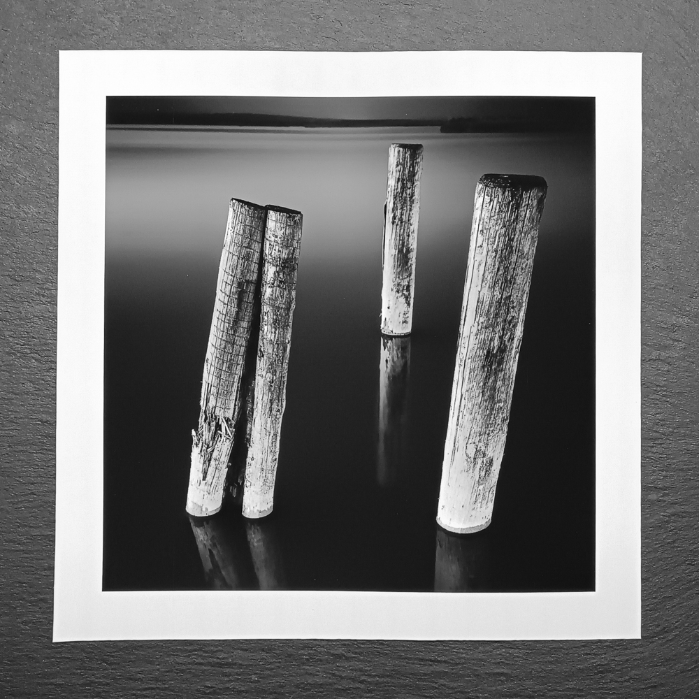 Zu sehen ist nichts Spektakuläres – nur vier Poller, die auch Dalben genannt werden. Das sind Holzpfähle im Wasser, die als Anlegepunkte für Boote dienen und sich als Fotomotiv, gerade für Langzeitbelichtungen, sehr gut eignen. Ob das bereits unter FineArt-Fotografie fällt: diese Entscheidung überlasse ich gerne den Betrachter:innen.